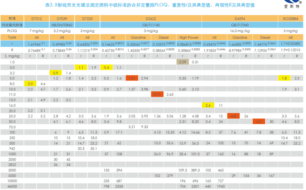 表2列出了幾乎所有ISO、中國、美國有關(guān)X射線熒光光譜法測定燃料中硫的標(biāo)準(zhǔn)。