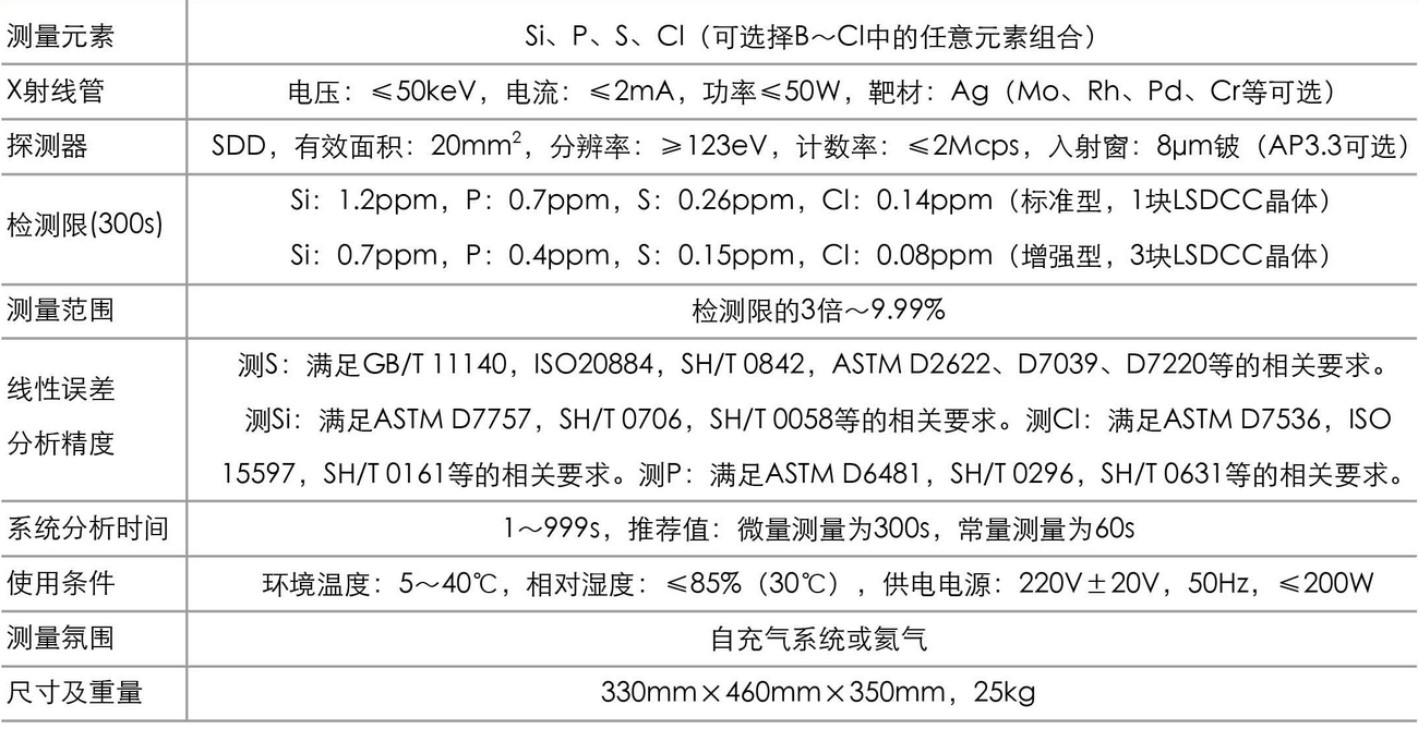 適用于煉油廠、檢測(cè)及認(rèn)證機(jī)構(gòu)、油庫(kù)、實(shí)驗(yàn)室測(cè)量范圍從0.5ppm到10%的各種油品(如汽油、柴油、重油、殘?jiān)剂嫌偷?/span>)、添加劑、含添加劑潤(rùn)滑油、以及煉化過程中的產(chǎn)品。