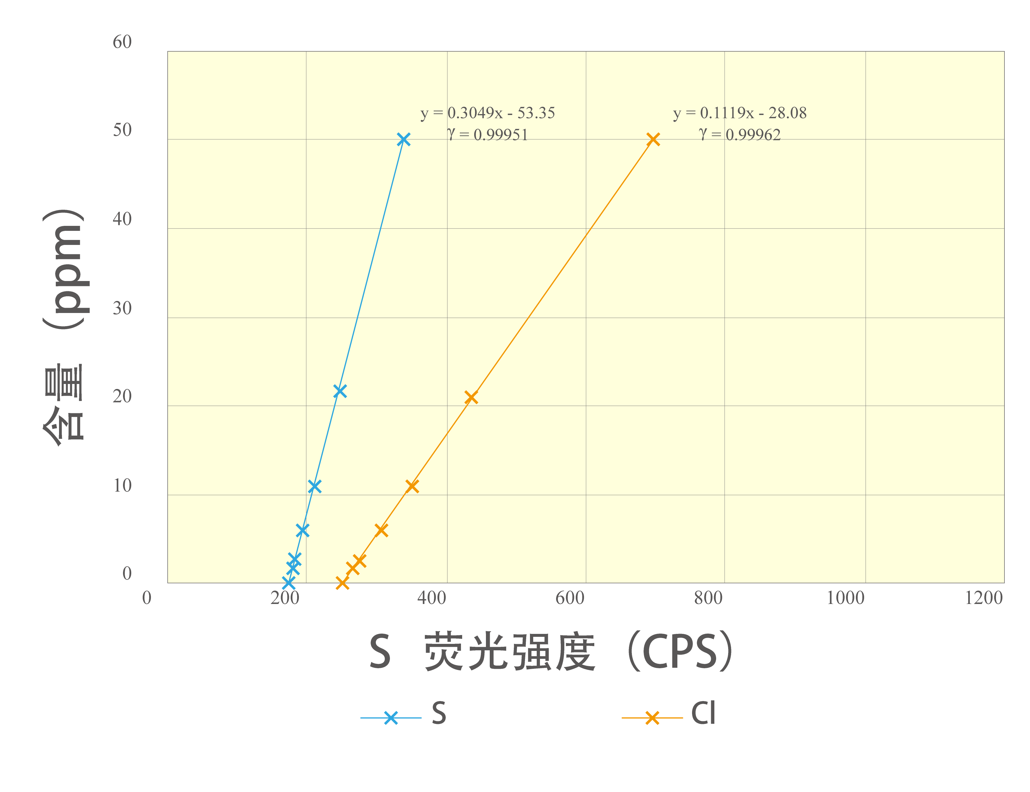 用已知含量的7個含S、Cl樣品對儀器進行標定,得圖7的工作曲線。