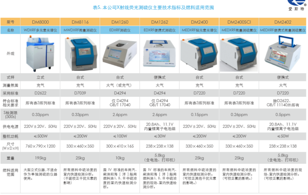 DM1260為能量色散臺式儀器,探測限為2.6ppm,可測限值50ppm的燃料中硫濃度,僅適合室內(nèi)使用。
